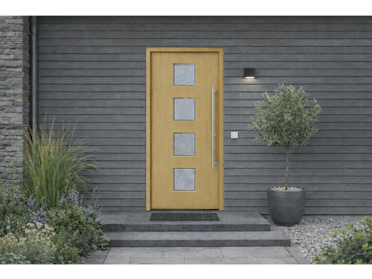 Diese Haustür aus Holz kombiniert modernes Design mit einer strukturierten Oberfläche. Die senkrechte Fräsung verleiht der Tür eine klare Gliederung, während der Stoßgriff aus Edelstahl einen modernen Akzent setzt. Maße, Holzart, Farbe, Griffsystem und Ausstattung können individuell bestimmt werden – ob Kiefer, Meranti oder Eiche, naturbelassen, lasiert oder in RAL-Farbe lackiert, inklusive anpassbarer Profilstärke und Sicherheitspakete.